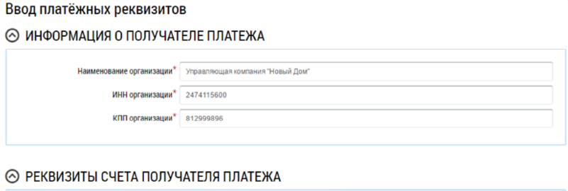 Чтобы заполнить реквизиты, на странице «Ввод платежных реквизитов» введите информацию в двух блоках: