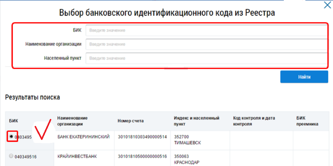 В поле «БИК кредитной организации» выберите нужное значение, воспользовавшись кнопкой «Выбрать БИК из Реестра». Для этого в окне «Выбор банковского идентификационного кода из Реестра» введите значения в одно или несколько поисковых полей и нажмите кнопку «Найти». Выберите значение в списке Результатов поиска.