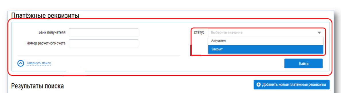 Чтобы в блоке «Результаты поиска» отражались только актуальные платежные реквизиты, в поисковой части страницы «Платежные реквизиты» в строке «Статус» выберите значение «Актуален». Нажмите кнопку «Найти».