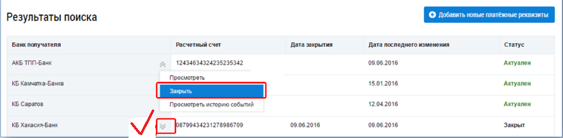 Добавленные реквизиты нельзя редактировать. Если платежный реквизит утратил актуальность или вы вписали ошибочные данные, то его можно закрыть. Для этого необходимо: