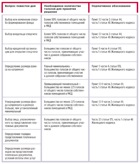 Будьте осторожны, когда формируете повестку для собрания о смене способа формирования ФКР. Есть вопросы, по которым «за» должно проголосовать квалифицированное большинство. Чтобы исключить ошибку, мы подготовили подсказку, какого кворума достаточно для решения того или иного вопроса из категории «капитальный ремонт» (таблица).