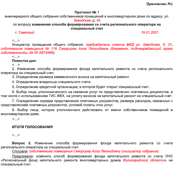 На рисунке 3 мы показали пример, как будет выглядеть протокол общего собрания о смене способа формирования ФКР по требованиям Жилищного кодекса. Приложение №1.