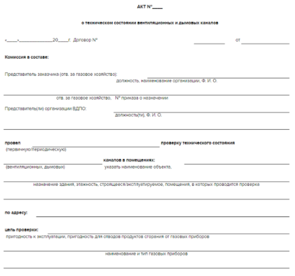 По результатам проверки нужно составить акт технического обследования вентканалов. Закон не предусматривает типовой формы, акт составляют в свободной форме. На рисунке 1 мы показали пример заполненного акта.