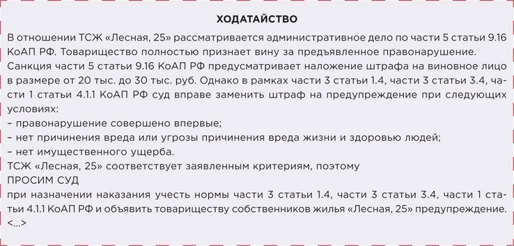 Кому и как перестроить работу: юристам ТСЖ, ЖК и ЖСК. Заявите ходатайство о замене штрафа на предупреждение, если жилищное объединение или его должностных лиц привлекли к ответственности по статьям 5.61.1, 6.4, 7.22, 7.23, 7.23.2, 8.1, части 1 статьи 9.1.1, частям 4, 5 статьи 9.16, частям 1, 5, 7–9 статьи 9.22, статьям 9.23, 13.11, части 2 статьи 14.5, части 1 статьи 4.6, статье 19.7 КоАП. Используйте шаблон, который мы показали на рисунке 1.