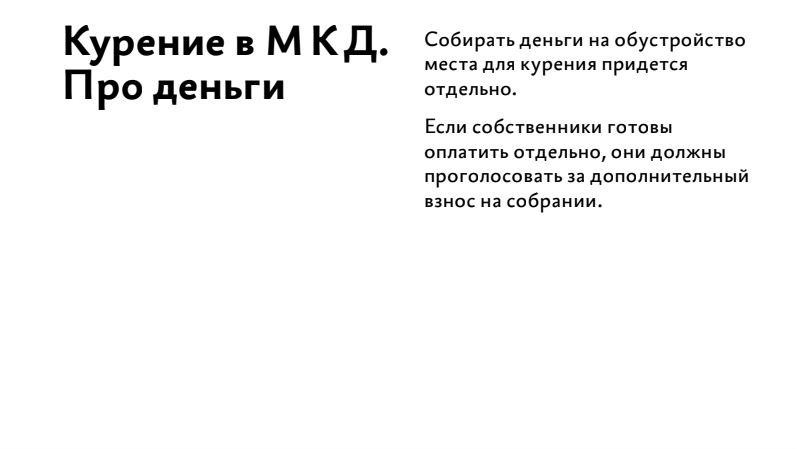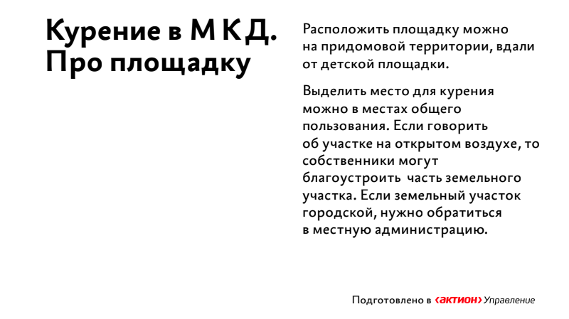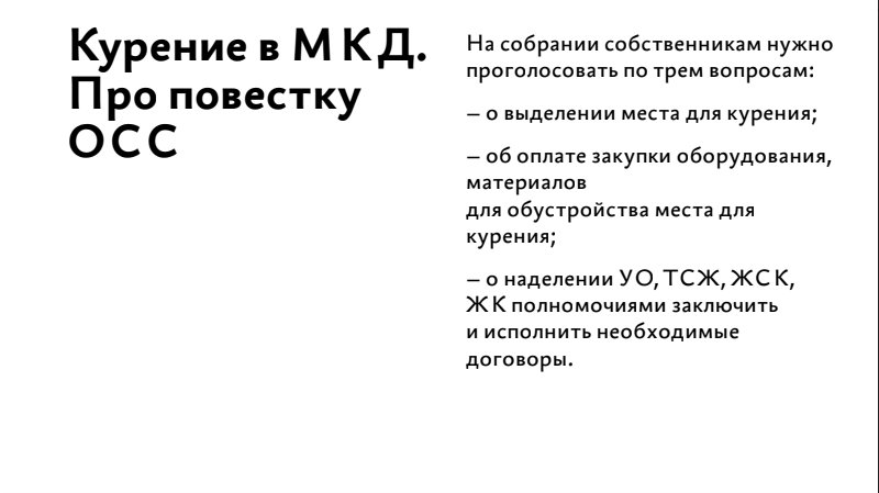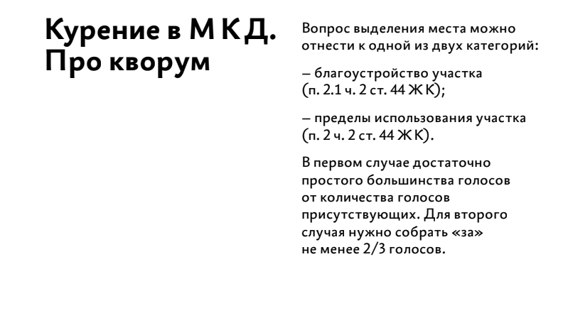 Посмотрите короткую презентацию о том, где можно расположить площадку, какой должна быть повестка собрания «для курильщиков», какой нужен кворум.